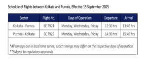 * Direct, thrice weekly connectivity between Kolkata and Purnea to commence from 15 September 2025
