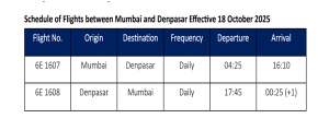 AVIATION: INDIGO STRENGTHENS ITS CONNECTIVITY TO INDONESIA DAILY FLIGHTS ON MUMBAI-DENPASAR-MUMBAI ROUTE STARTING 18 OCTOBER 2025