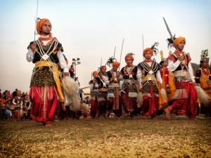 Home » PICTURE OF THE DAY : KHASI MALE DANCERS DON AN EXQUISITE TRADITIONAL ATTIRE, A REFLECTION OF THEIR RICH CULTURE. THE ENSEMBLE INCLUDES A JYMPHONG, A SLEEVELESS COAT CRAFTED FROM HANDWOVEN SILK FEATURING INTRICATE PATTERNS AND LIVELY COLOURS. ( PHOTO COURTESY – MEGHALAYA TOURISM)